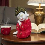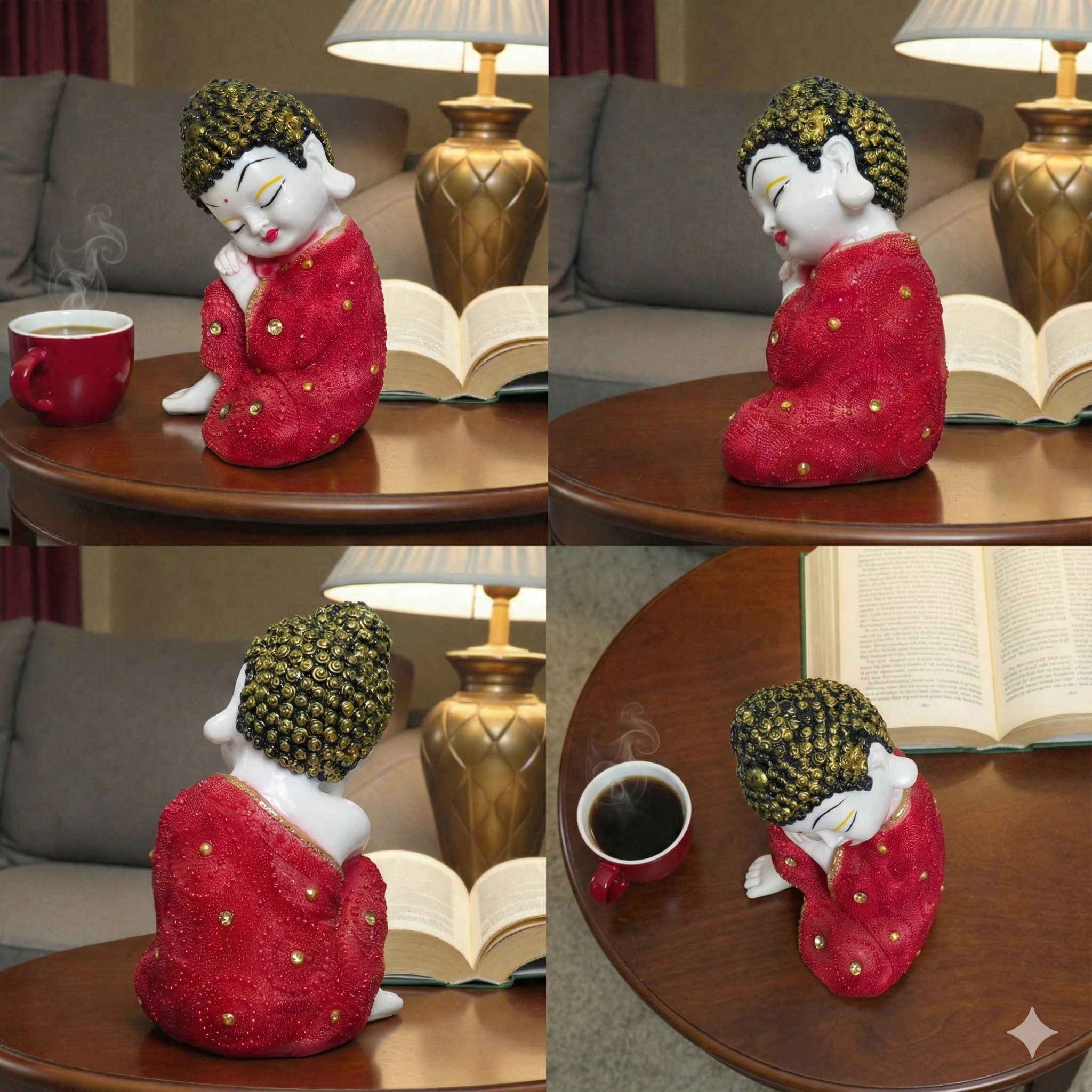 Add a touch of whimsy and charm to your home decor with this delightful sleeping Buddha figurine. Crafted with exquisite attention to detail, this decorative piece features a serene expression adorned in a striking red sparkly dress with golden accents. The figurine’s distinctive curly black and gold-tinted hair adds character, while the peaceful, dreaming pose creates a calming atmosphere. Perfect as a centrepiece for your coffee table, bookshelf, or meditation space, this ornament beautifully complements both modern and traditional interiors. The combination of white polyresin rich shine finish with the vibrant red attire makes it a standout piece that’s sure to draw admiring glances. Whether used as home decor or given as a thoughtful gift, this sleeping Buddha statue brings a sense of tranquillity and artistic elegance to any space.