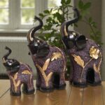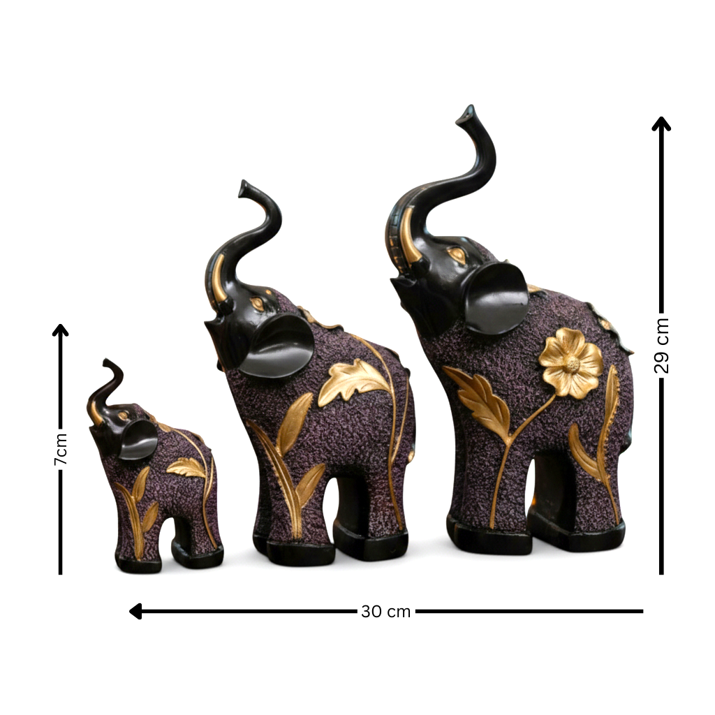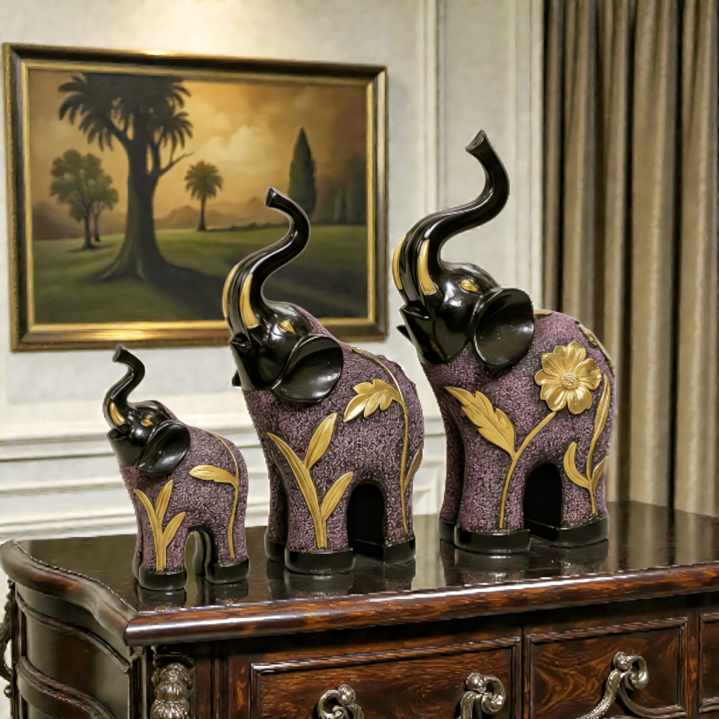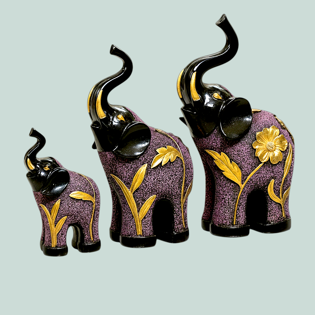 This exquisite set of three decorative elephant figurines brings timeless elegance and cultural charm to any living space. Each elephant is beautifully crafted with a rich textured finish in deep purple tones, complemented by striking black accents and delicate golden floral embellishments that add a touch of luxury. The elephants are positioned in a graceful family arrangement with their trunks raised upward, a traditional symbol of good fortune, prosperity, and positive energy. The intricate golden leaf and flower details hand-painted on each piece showcase exceptional craftsmanship and attention to detail. Perfect for display on mantels, shelves, coffee tables, or as a centrepiece, this decorative trio adds sophistication to both contemporary and traditional interiors. The varying sizes create visual interest and depth, making this set an ideal gift for housewarmings, festivals, or special occasions. These statement pieces effortlessly elevate your home décor whilst celebrating the majestic beauty of these beloved creatures. Display them together for maximum impact or arrange them throughout your space to create cohesive styling.