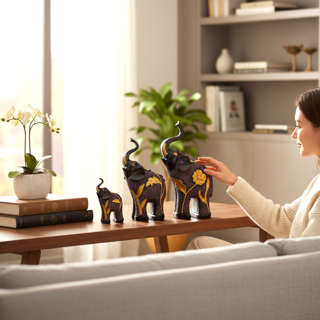 Symbolic Design: Elephants positioned with raised trunks represent positive energy, strength, and good luck, making them ideal for living rooms, shelves, or office spaces.