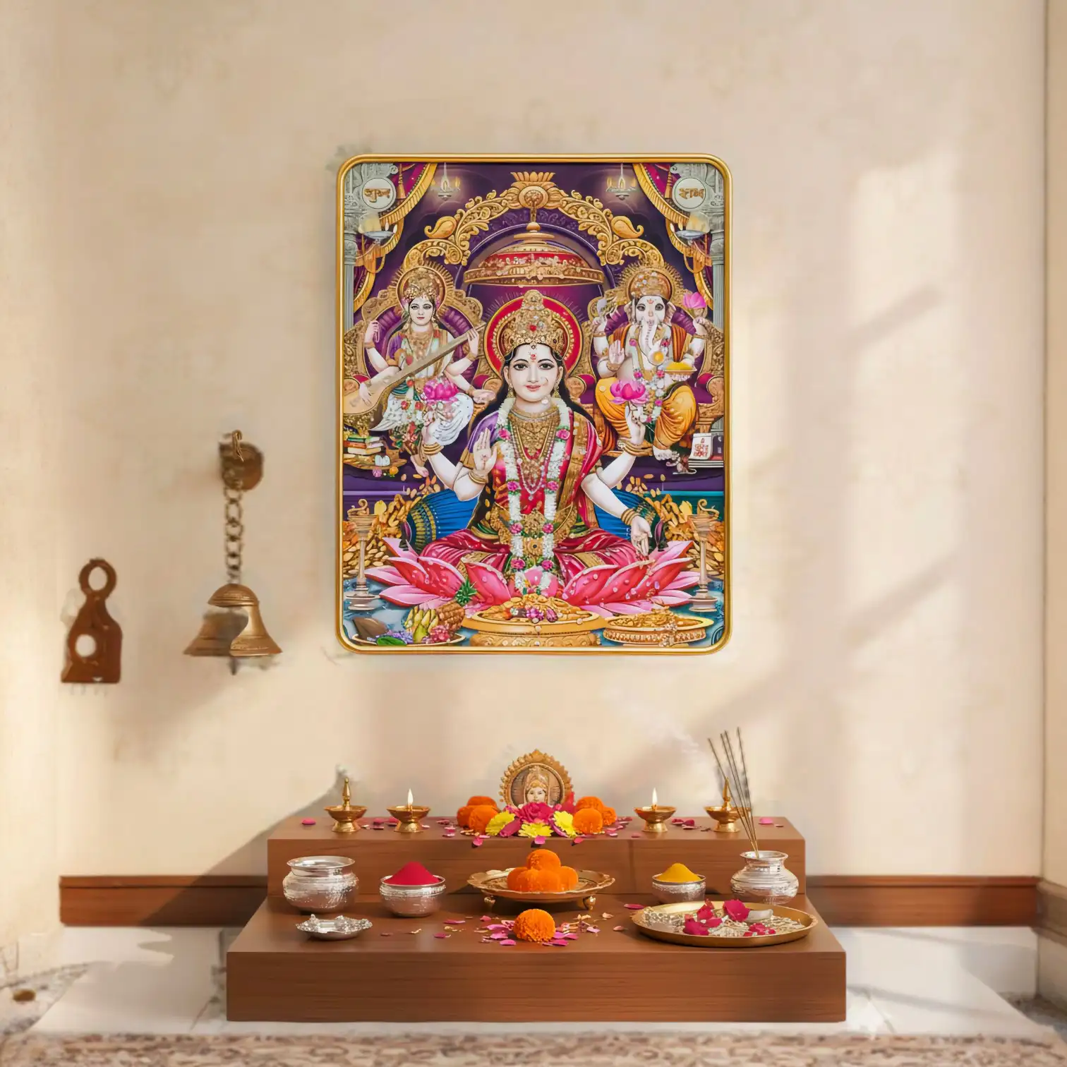 This premium wall art frame showcases the three deities together — Goddess Laxmi, symbolizing wealth and prosperity; Lord Ganesha, representing wisdom and success; and Goddess Saraswati, embodying knowledge and creativity.